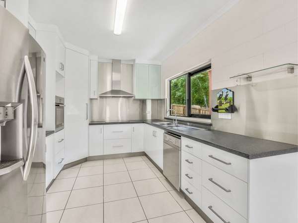 • Designer kitchen with industrial stainless steel splashback for the serious chef. Ample bench space, mostly pull-out cabinetry makes storage easy. New Bosch electric oven, stainless steel 900mm canopy blends with frosted glass and steel overhead cupboards, including bulk heads. The Induction 600mm cooktop is instantly cool to touch when switched off. The kitchen includes a dishwasher and a plumbed-in side by side Fridge/Freezer with automatic cold filtered water and crushed ice dispensers, perfect for your tropical lifestyle. Crimsafe kitchen screens overlook the nature reserve and your patio, adding peace of mind.